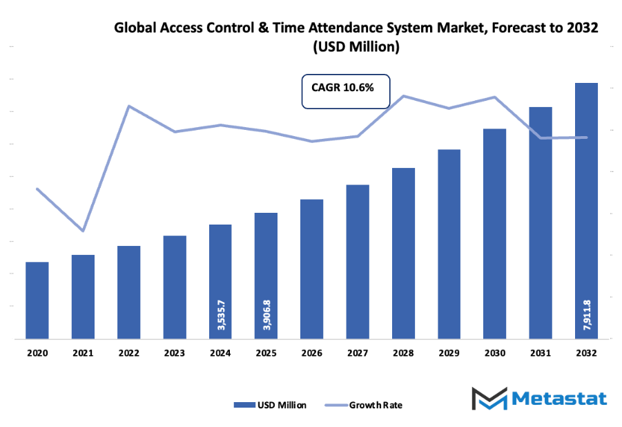 - Global access control & time attendance system market of approximately USD 3906.8 million in 2025 with a CAGR of roughly 10.6% between 2032, and it is going to be even more in value than USD 7911.8 million.