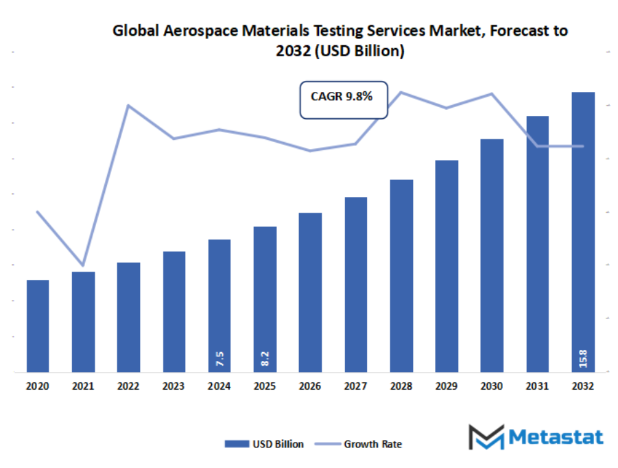 - The global aerospace materials testing services market valued at approximately USD 8.2 Billion in 2025, growing at a CAGR of around 9.8% through 2032, with potential to exceed USD 15.8 Billion.