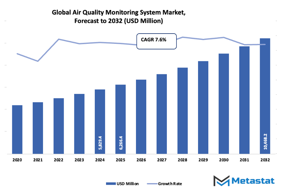 - Global air quality monitoring system market value of approximately USD 6266.4 million in 2025, which is likely to grow at a CAGR of approximately 7.6% until 2032, with the potential to grow beyond USD 10468.2 million.