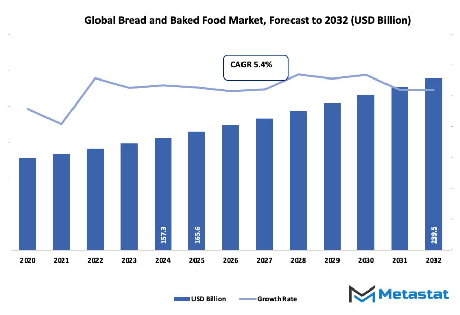 - Global bread and baked food market worth around USD 165.6 Billion in 2025, growing at a CAGR of around 5.4% from 2032, with growth potential to exceed USD 239.5 Billion.