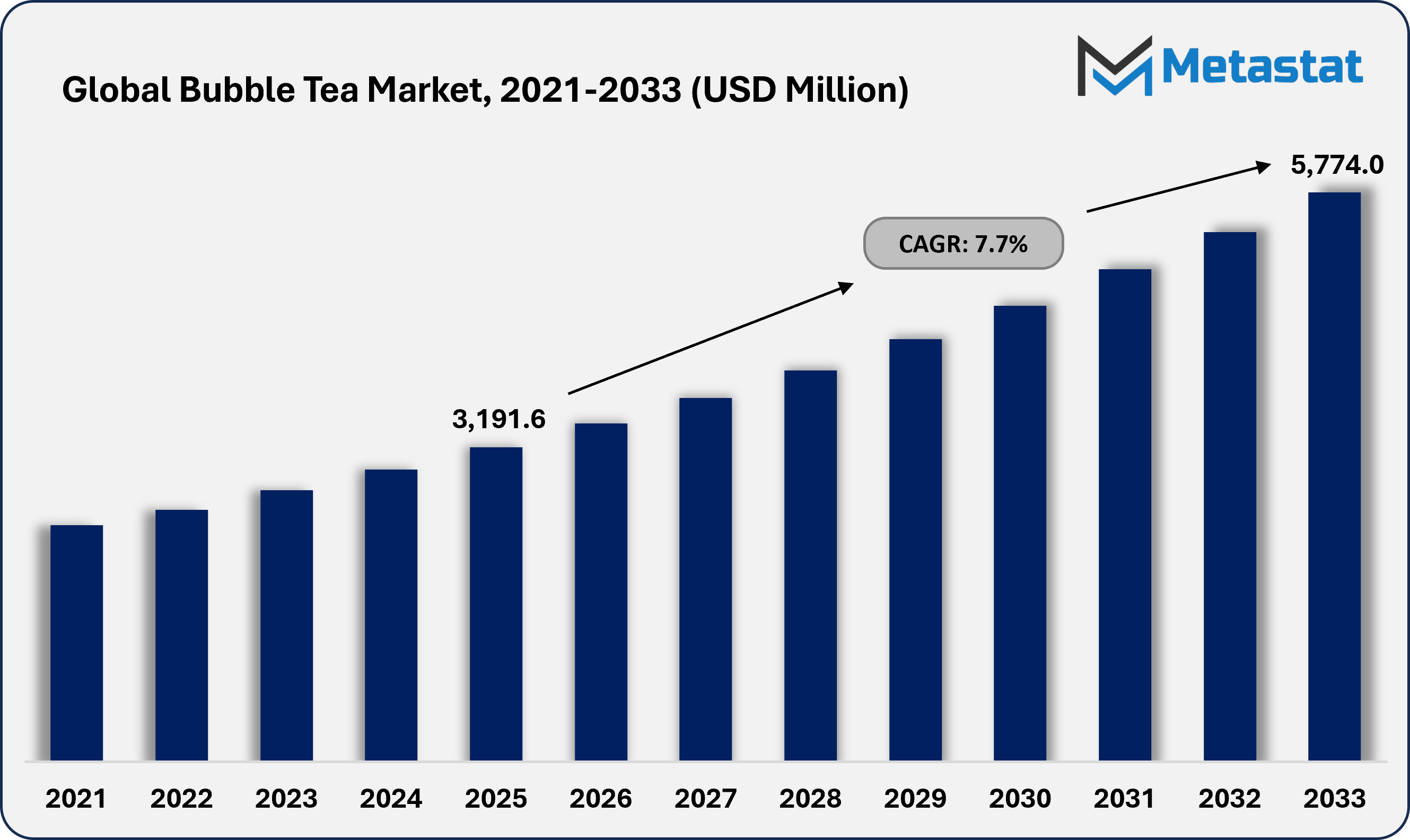 - Global bubble tea market is valued at USD 3,191.6 million in 2025, growing at a CAGR of around 7.7% through 2033, with potential to exceed USD 5,774 million.