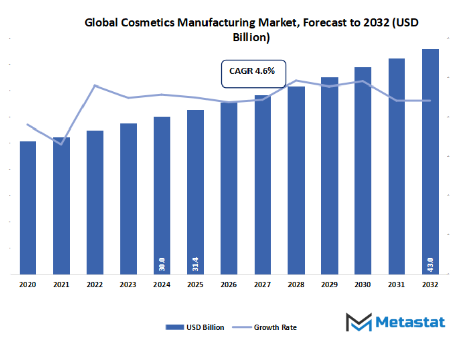 Market size is forecast to rise from USD 31.4 Billion in 2025 to over USD 43 Billion by 2032. Cosmetics Manufacturing will maintain dominance but face growing competition from emerging formats.