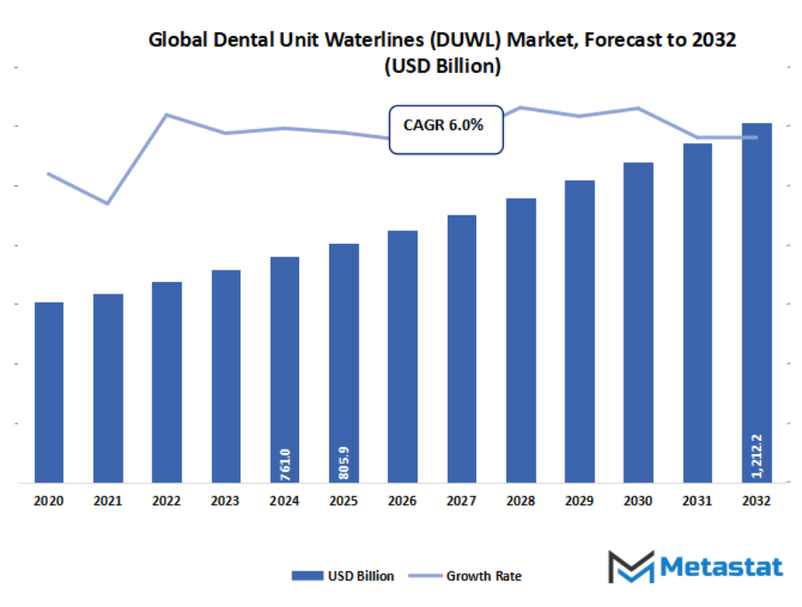 - The global dental unit waterlines (DUWL) market valued at approximately USD 805.9 Billion in 2025, growing at a CAGR of around 6.0% through 2032, with potential to exceed USD 1212.2 Billion.