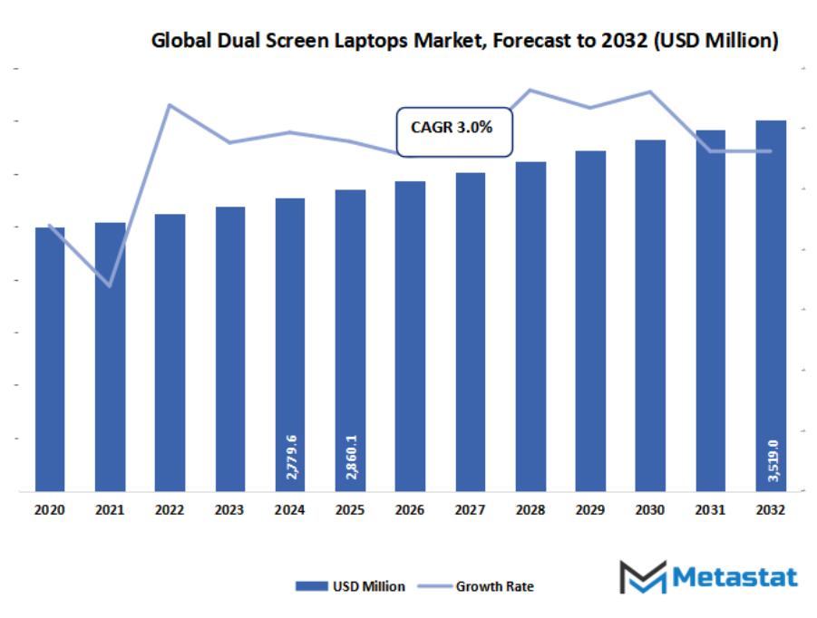 - Global dual screen laptops market valued at approximately USD 2860.1 million in 2025, growing at a CAGR of around 3.0% through 2032, with potential to exceed USD 3519 million.