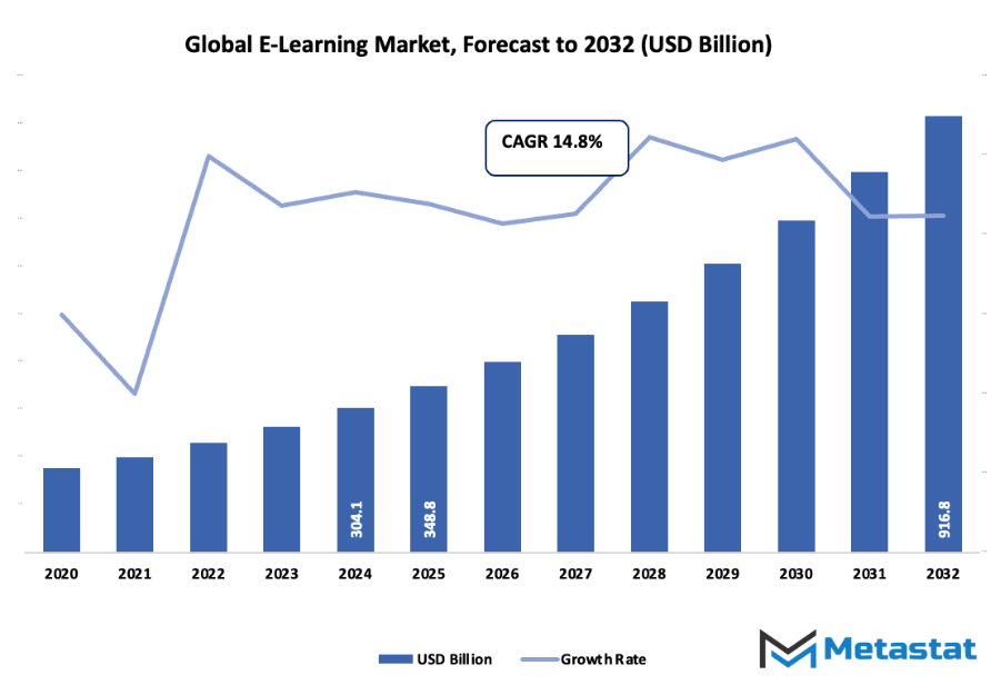 Market size is forecast to rise from USD 348.8 Billion in 2025 to over USD 916.8 Billion by 2032. E-Learning will maintain dominance but face growing competition from emerging formats.