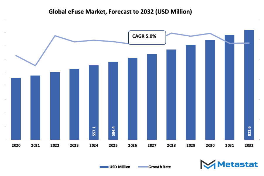 - Global eFuse market worth about USD 584.4 million in 2025, growing at a CAGR of about 5.0% until 2032 and with the prospect to grow beyond USD 822.6 million.