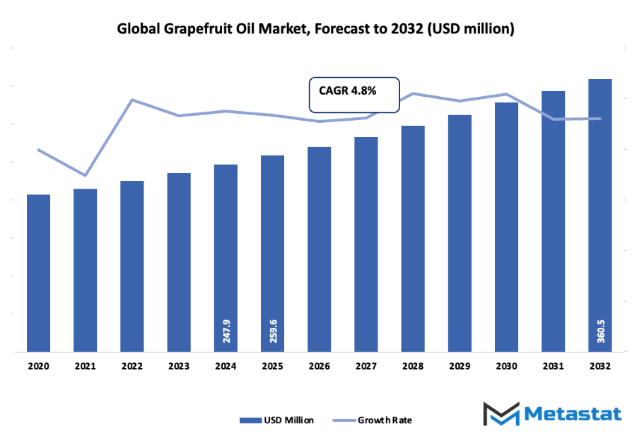 - The global grapefruit oil market was about USD 259.6 million in 2025, and it will grow at a CAGR of around 4.8% till 2032, with the possibility of going beyond USD 360.5 million.