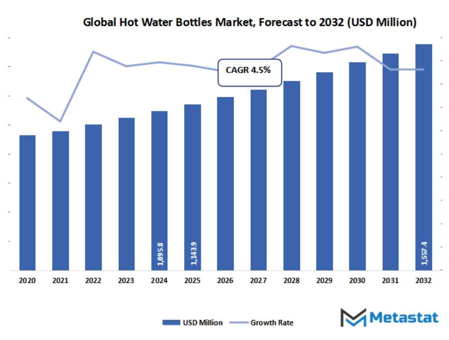 - The global hot water bottles market valued at approximately USD 1143.9 million in 2025, growing at a CAGR of around 4.5% through 2032, with potential to exceed USD 1557.4 million.