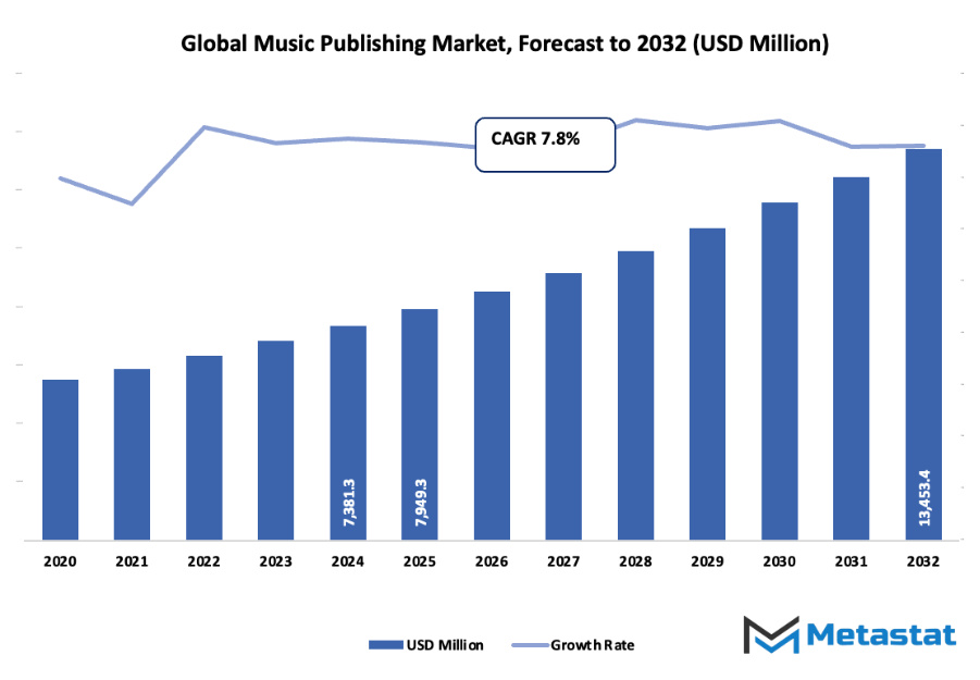 Market size is forecast to rise from USD 7949.3 million in 2025 to over USD 13453.4 million by 2032. Music Publishing will maintain dominance but face growing competition from emerging formats.