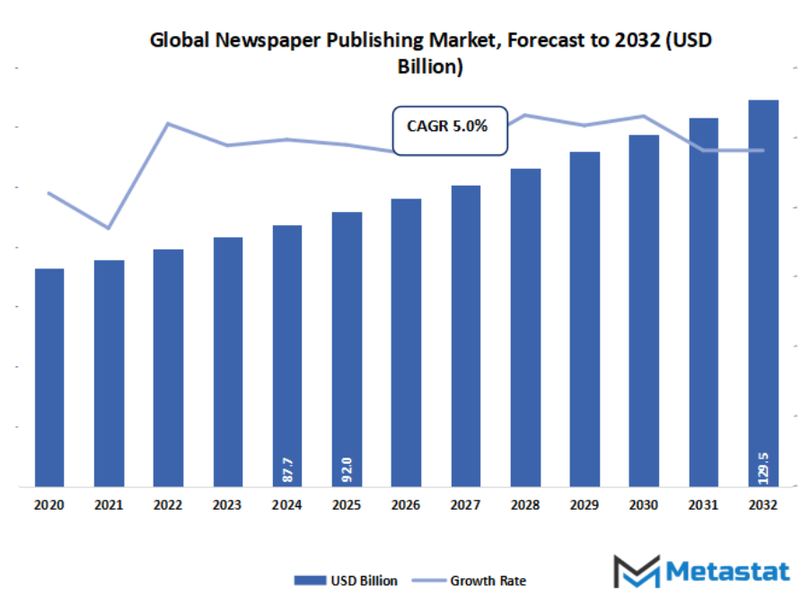 - Global newspaper publishing market valued at approximately USD 92 Billion in 2025, growing at a CAGR of around 5.0% through 2032, with potential to exceed USD 129.5 Billion.