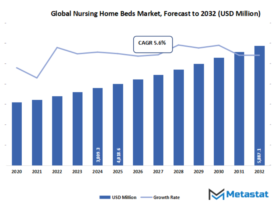 - The global nursing home beds market valued at approximately USD 4018.6 million in 2025, growing at a CAGR of around 5.6% through 2032, with potential to exceed USD 5887.1 million.