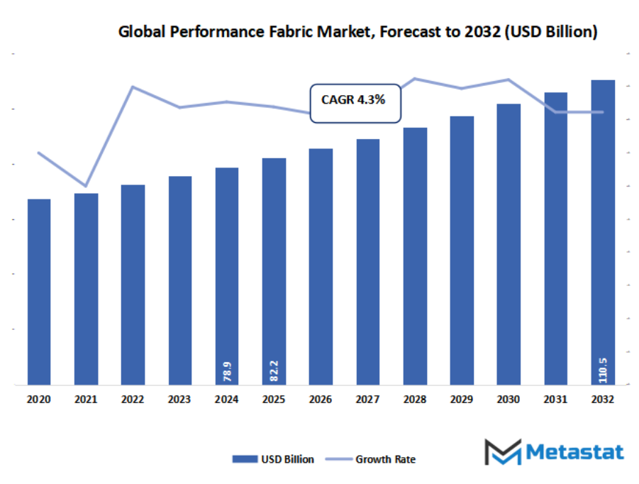 - Global performance fabric market valued at approximately USD 82.2 Billion in 2025, growing at a CAGR of around 4.3% through 2032, with potential to exceed USD 110.5 Billion.