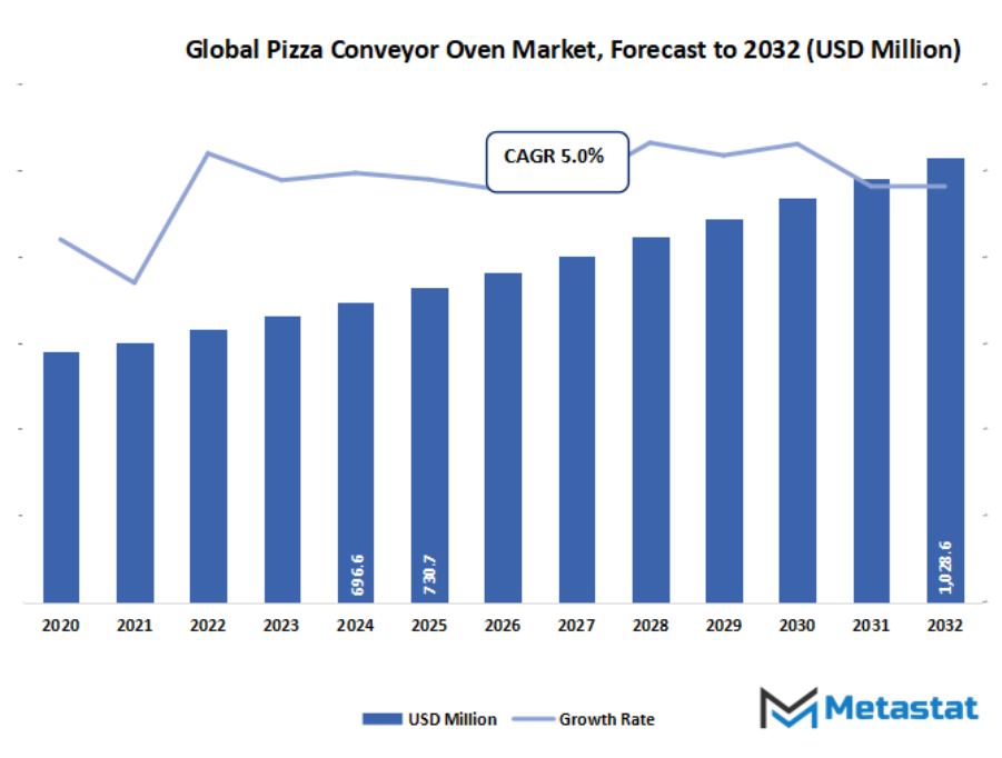 - The global pizza conveyor oven market valued at approximately USD 730.7 million in 2025, growing at a CAGR of around 5.0% through 2032, with potential to exceed USD 1028.6 million.
