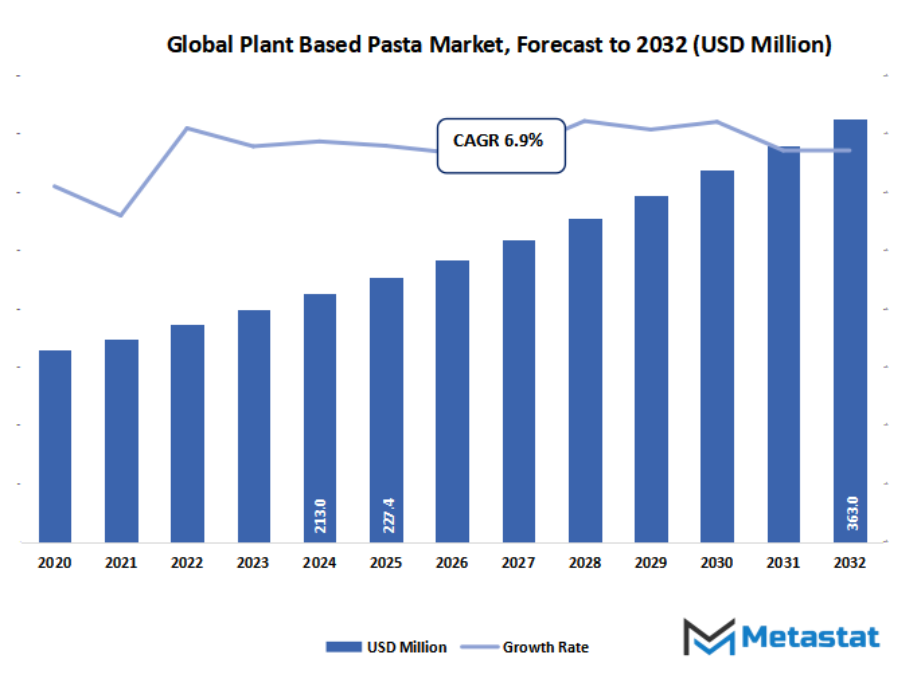 - Global plant based pasta market valued at approximately USD 227.4 Million in 2025, growing at a CAGR of around 6.9% through 2032, with potential to exceed USD 363 Million.