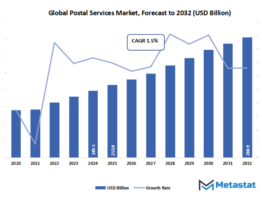 - Global postal services market valued at approximately USD 253 Billion in 2025, growing at a CAGR of around 1.5% through 2032, with potential to exceed USD 280.9 Billion.