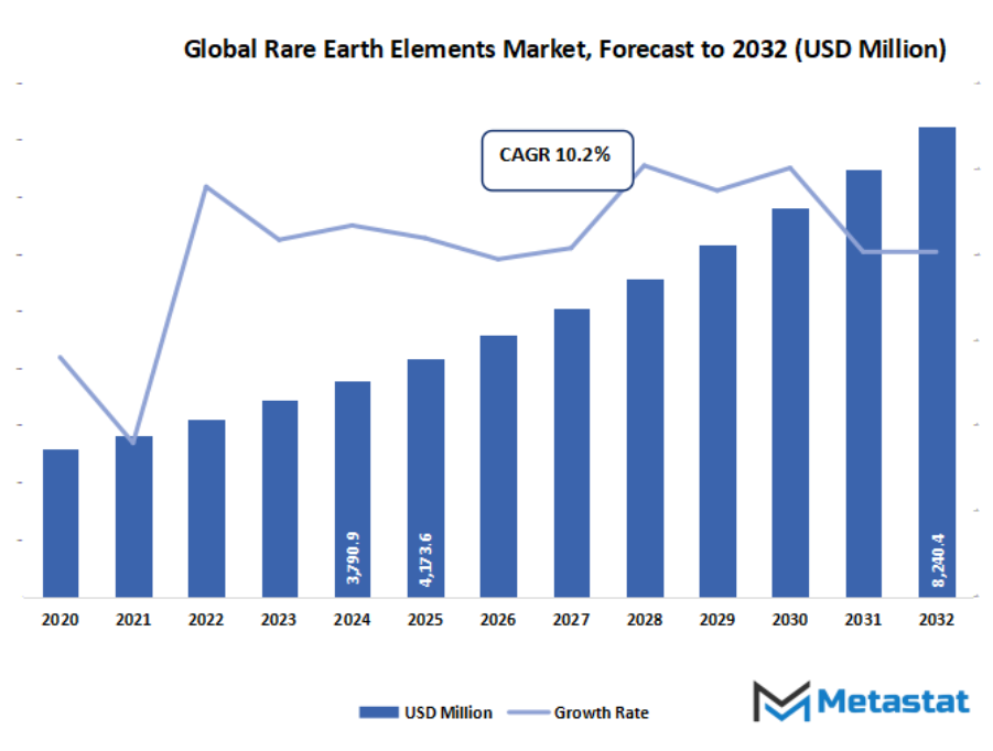 - The global rare earth elements market valued at approximately USD 4173.6 million in 2025, growing at a CAGR of around 10.2% through 2032, with potential to exceed USD 8240.4 million.