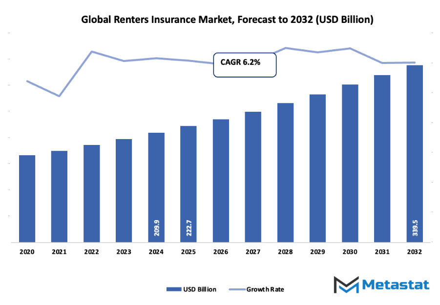 - Global renters insurance market valued at approximately USD 222.7 Billion in the year 2025 and is growing at a CAGR of approximately 6.2% from 2025 to 2032, with the potential to exceed USD 339.5 Billion.