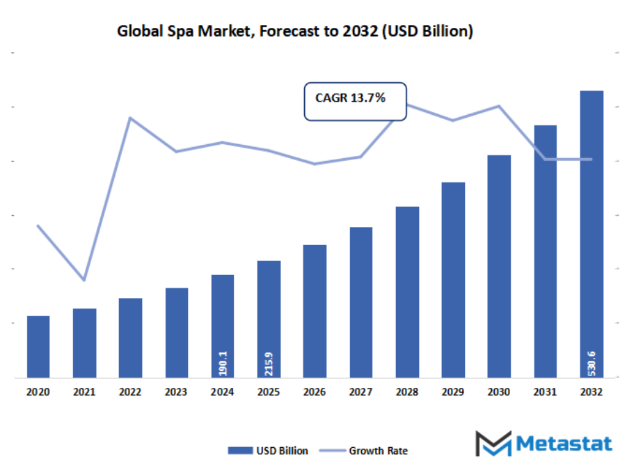 • The global spa market valued at approximately USD 215.9 Billion in 2025, growing at a CAGR of around 13.7% through 2032, with potential to exceed USD 530.6 Billion.